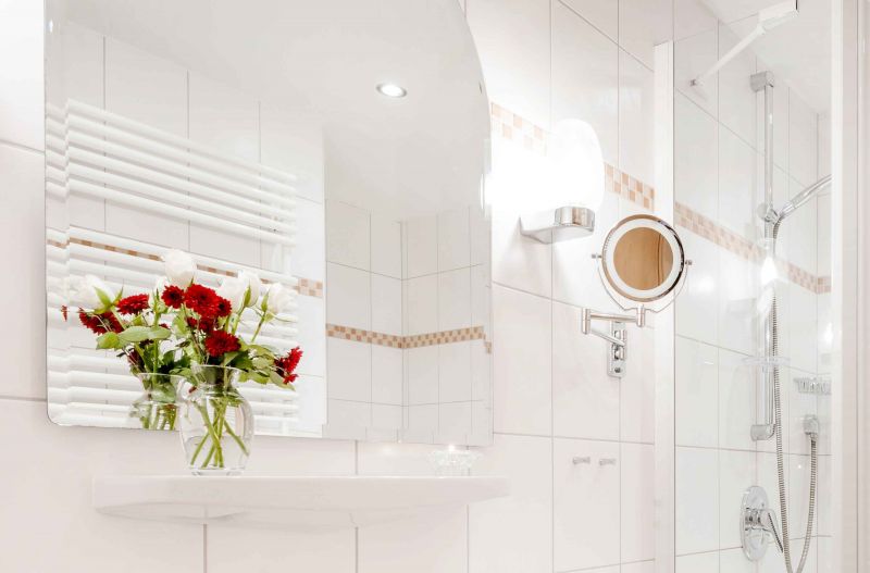 1 Badezimmer mit Dusche, WC, Schminkspiegel, Handtuchwärmer, Föhn