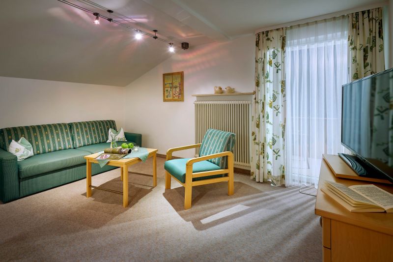 1 Wohnzimmer mit gemütlicher Sitzecke, ausziehbarer Couch, Sessel und Couchtisch